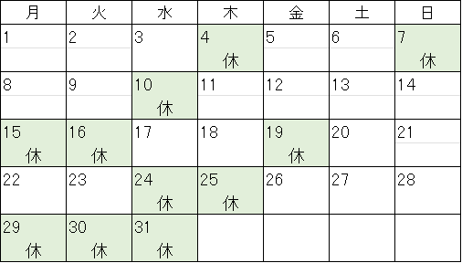 | 日 | 月 | 火 | 水 | 木 | 金 | 土 |